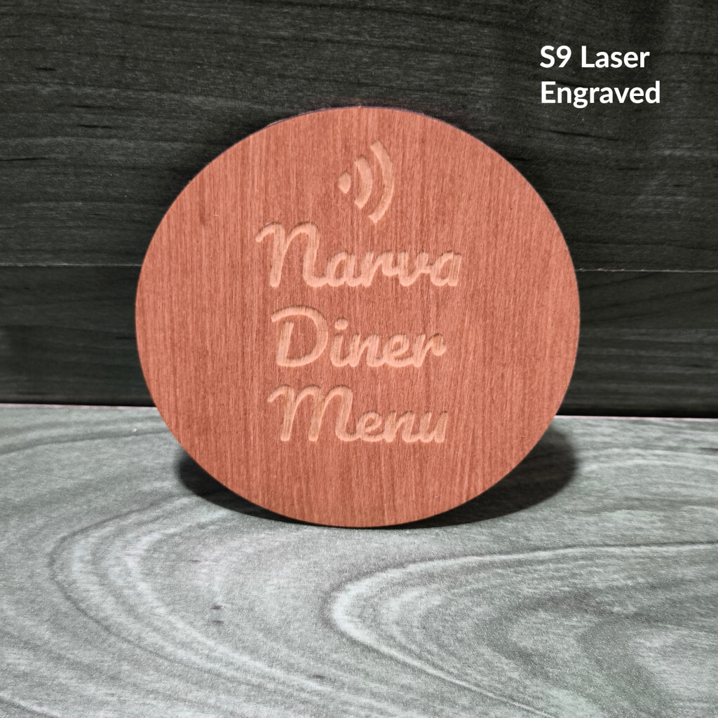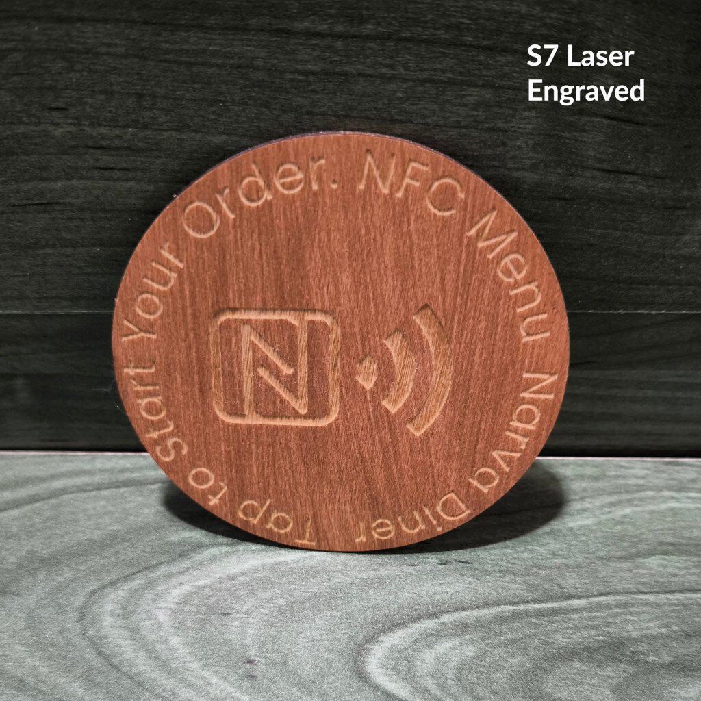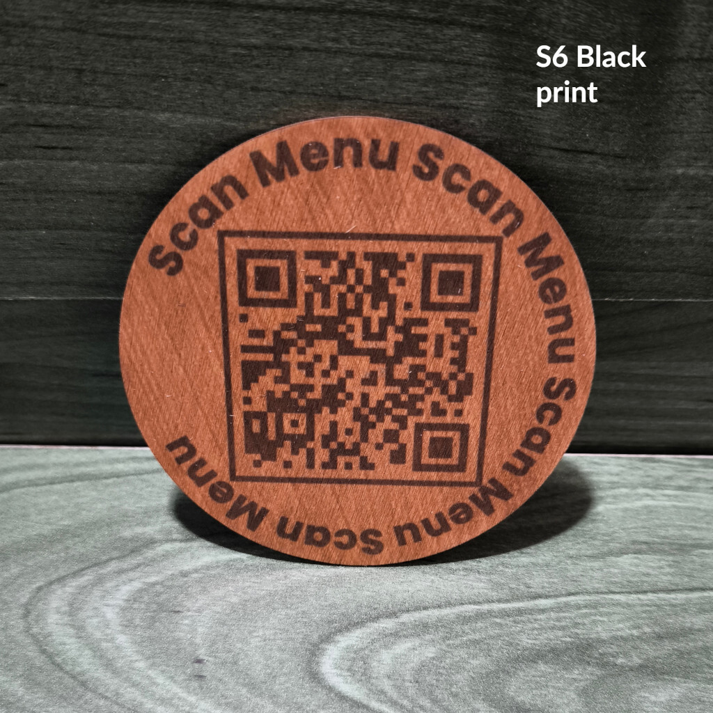Kompaktne ümmargune puidust QR- ja valikulise NFC-lahendusega lauasilt menüü, WiFi või arvustuste jaoks. Saadaval ühepoolse 9 × 9 cm kettana või kahepoolse 9 × 9 cm NFC-sildina, kas lasergraveeritud või kvaliteetse värvilise kuumtrükiga.