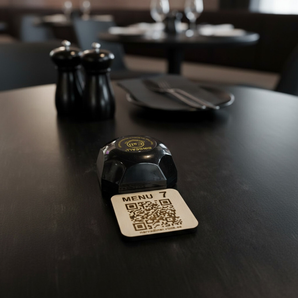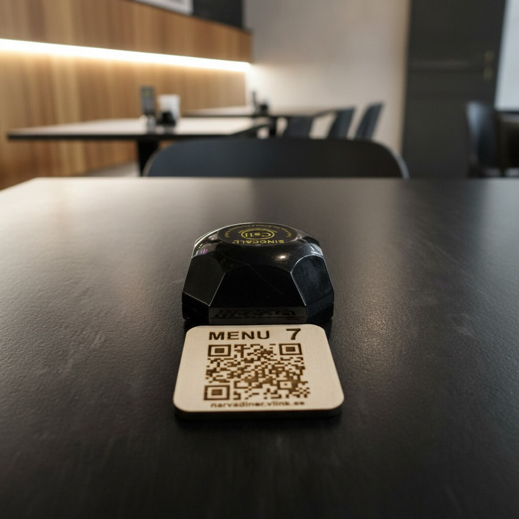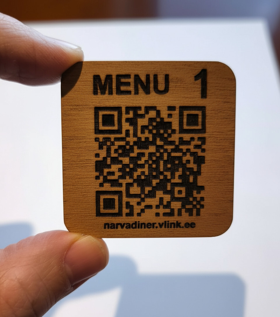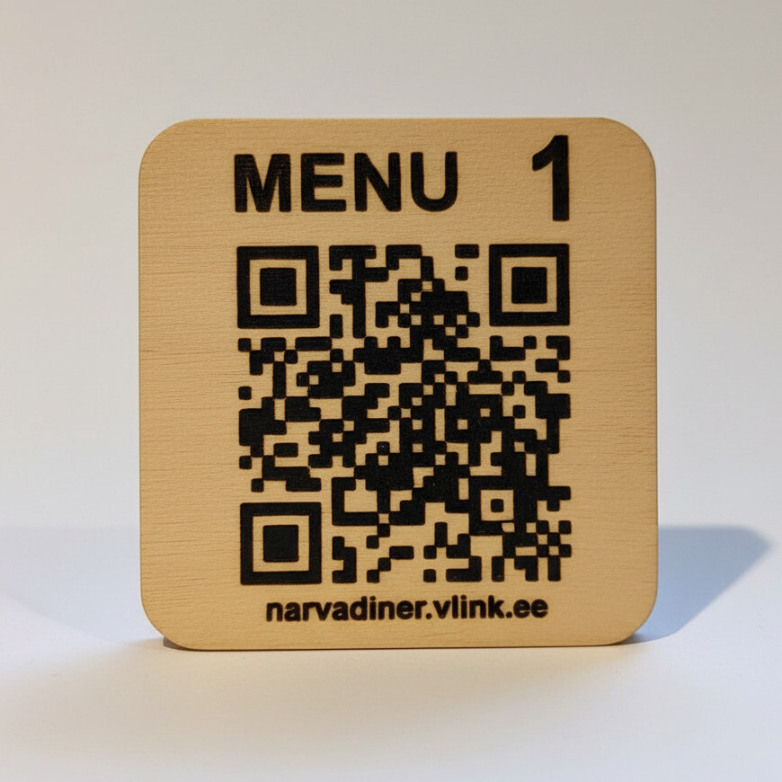 Kvaliteetsest vineerist QR-koodiga silt menüü, tagasiside, WiFi või muu lingi jaoks. Graveerime laseriga teie QR-koodi, teksti ja logo 5 × 5 cm plaadile, soovi korral valmistame ka erimõõdus ja värvitud sildid.