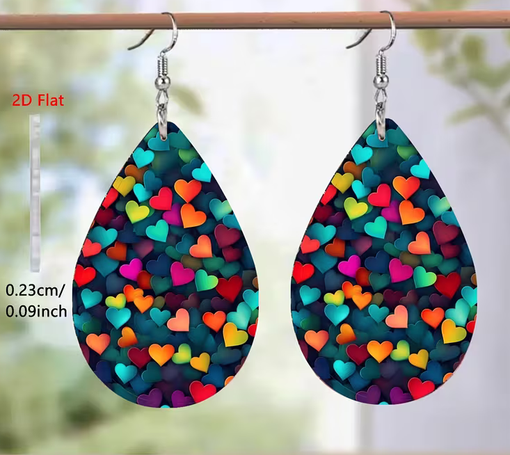 1 paar 2D lamedaid, mitmevärvilisi südamekujulisid kõrvarõngaid, valmistatud 316 roostevabast terasest ja akrüülist. Trendikas, mänguline, samas elegantne ja armas disain, sobib igapäevaseks kandmiseks ja sünnipäevapidudeks nii meestele kui naistele. Ideaa