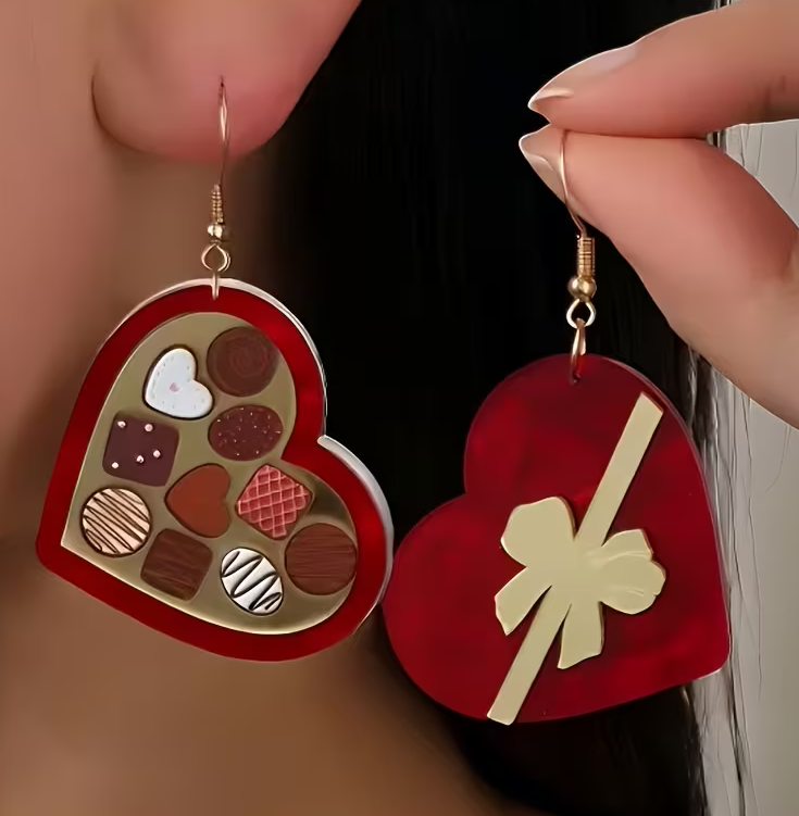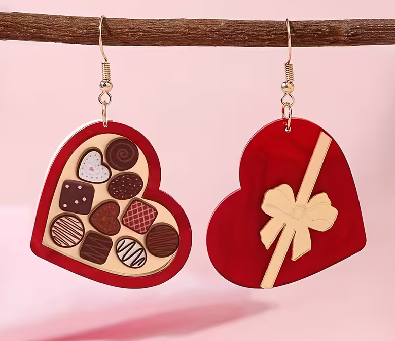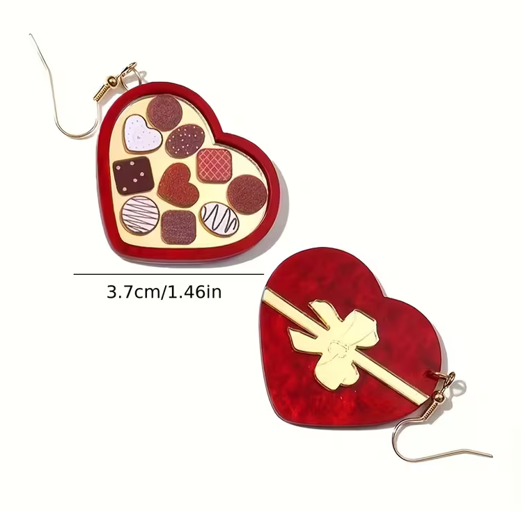 Chocolate Heart Dangle Earrings: 1 pair of elegant acrylic dangle earrings with heart cutouts and a red-and-gold bow—cute, playful, and perfect for everyday wear or special occasions. A lovely Valentine’s gift for her.